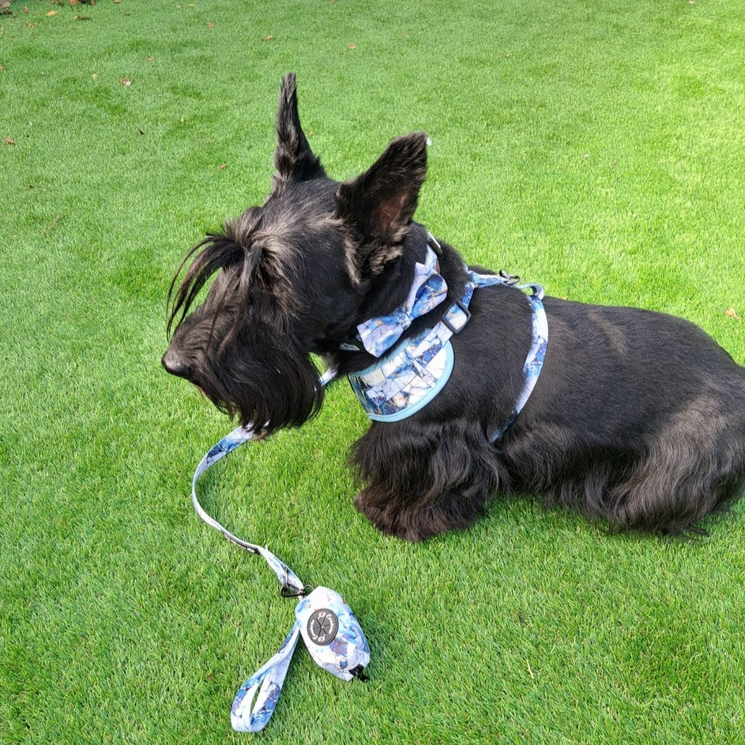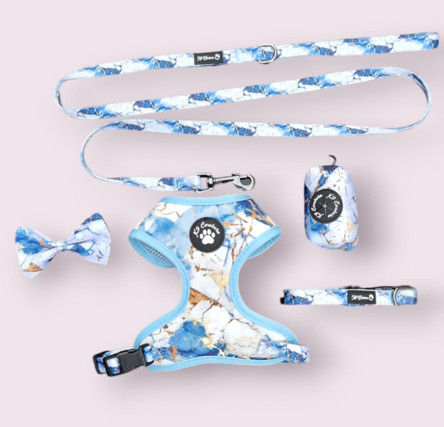 Whether you're taking a leisurely stroll in the park or heading out for a day of fun. The handy poo bag holder makes it simple and stylish to keep the environment clean while on the go. Make every walk a fashionable affair with this delightful marble blue-themed pet accessory set!